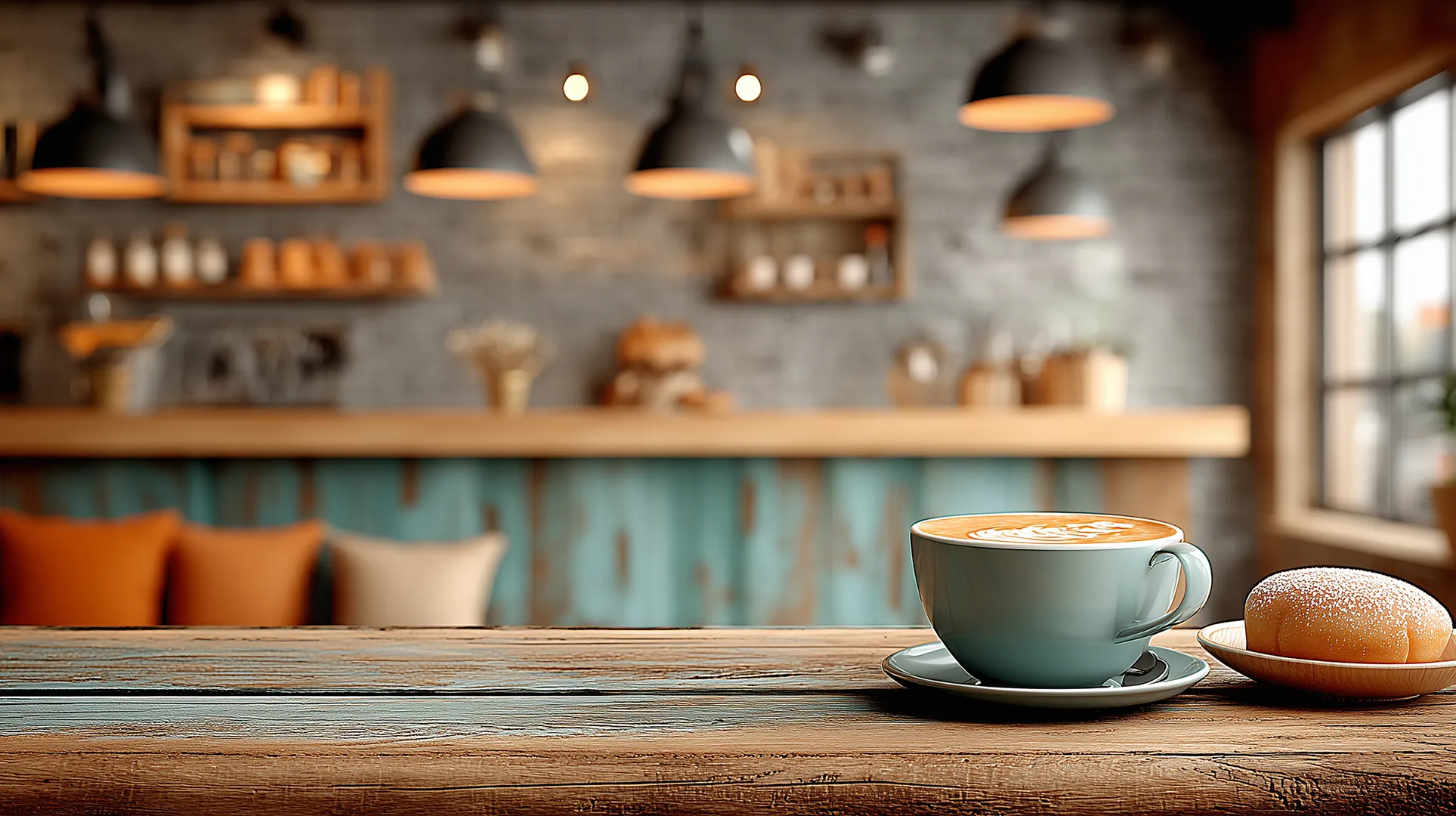 この画像は、AIによって生成されたカフェの店内風景です。 コンクリートの無骨さと...
